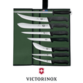 Victorinox professional knife roll set includes breaking, butcher, boning, skinning, and filleting knives, a 12" round sharpening steel, and an 8-slot heavy-duty canvas wrap for professional and outdoor use.